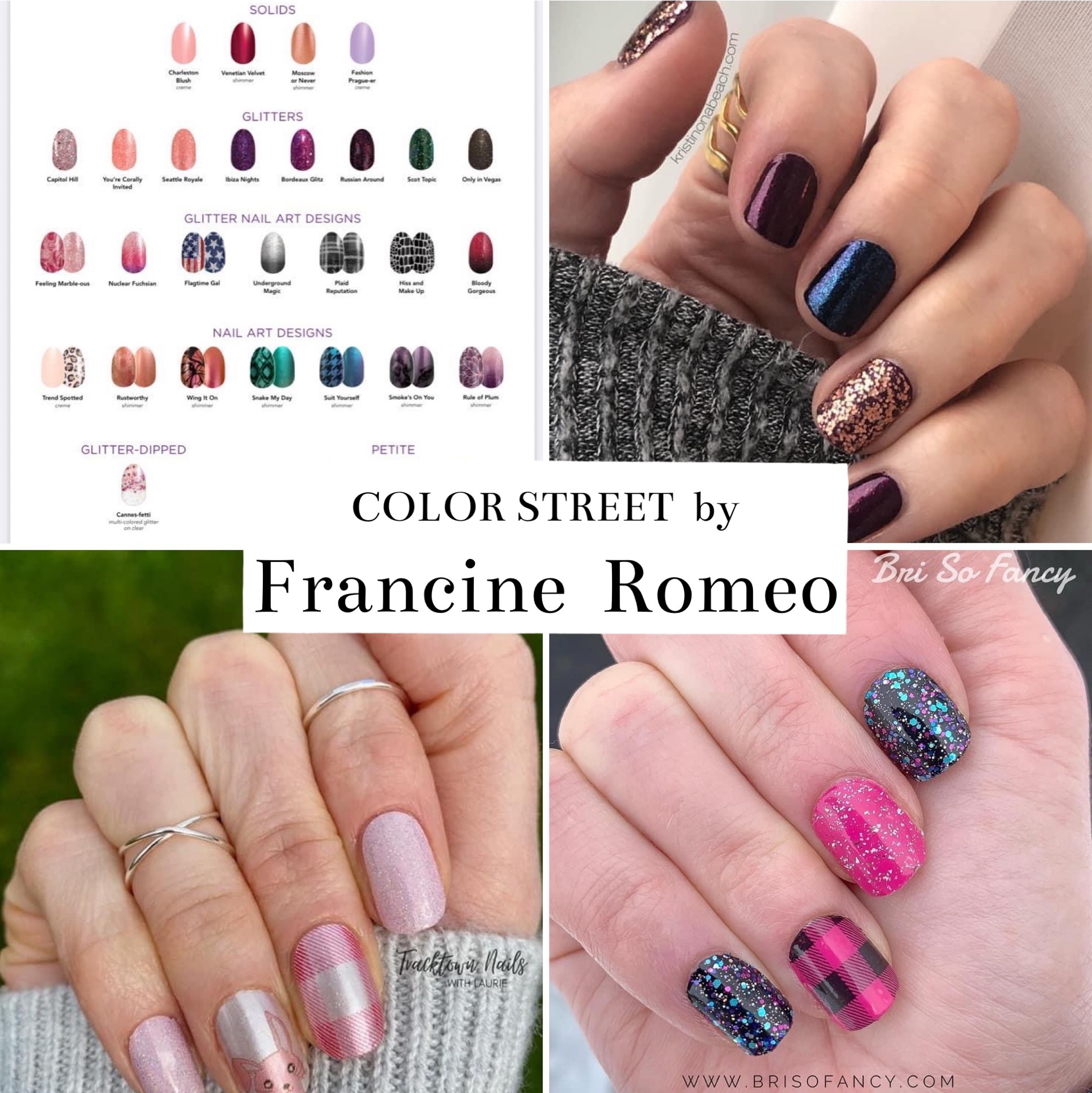 - Francine Romeo: Color Street representative. Easy, long-lasting mani-pedis at home. Connect with her on Facebook or join her Facebook group Manipedime. If you are local, she delivers!