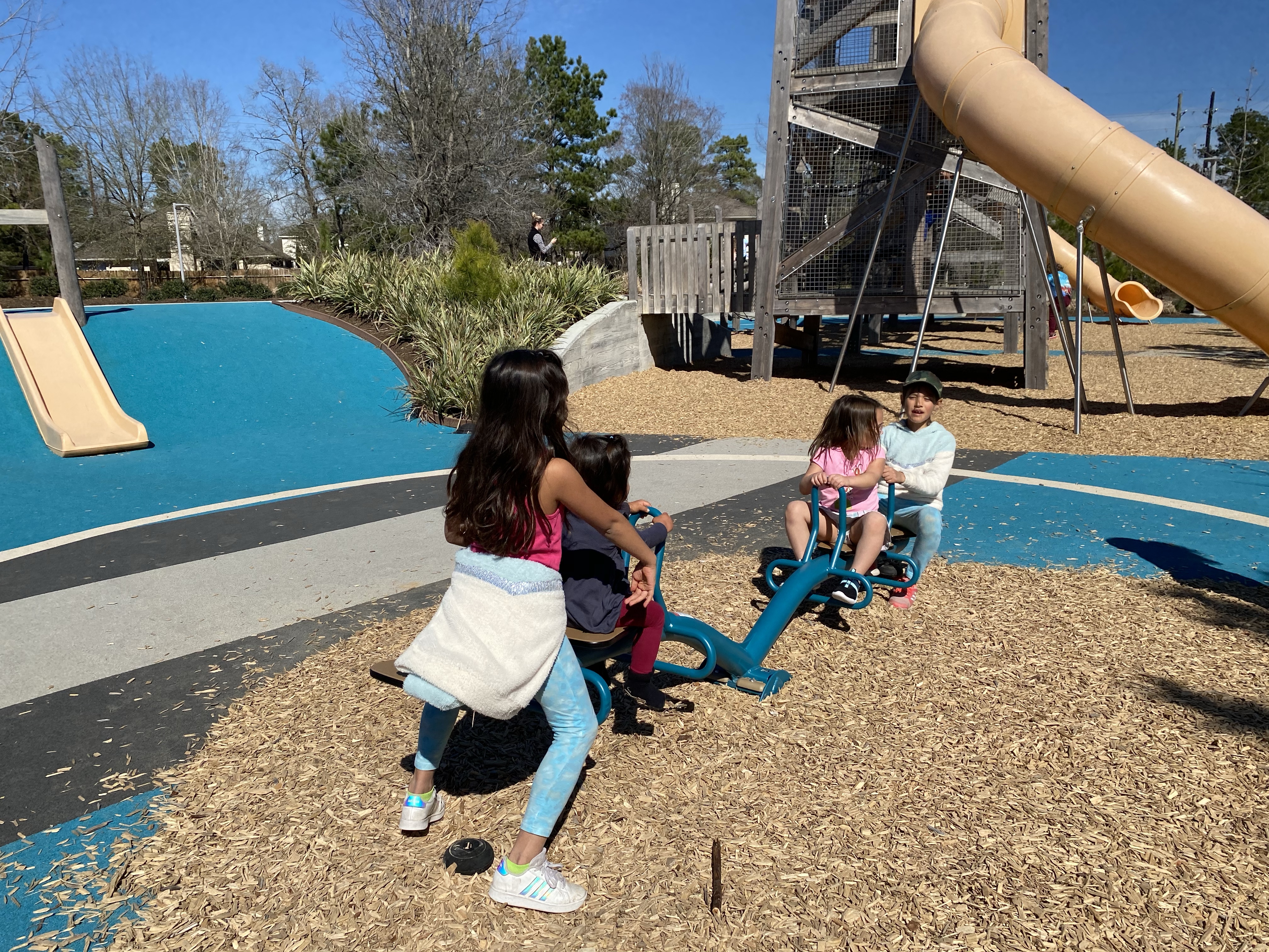 The newest addition to The Woodlands/Klein area has been Pine Cove Park which features a large wooden play structure, two large tube slides, two small slides and saucer swings. The large play structure is netted for safety.